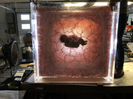For the opening scene in the Pilot episode of Euphoria, we were tasked to create an in camera effect that could later be slightly enhanced by CGI. The idea was to do as much in camera as possible with a newborn sized baby and an oversized water tank. The interior of the womb was fabricated and our rod puppeted silicone baby was dropped into the tank, all lighting was from behind.