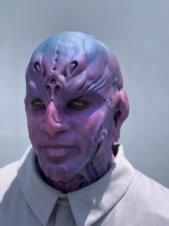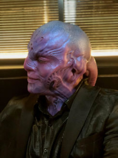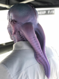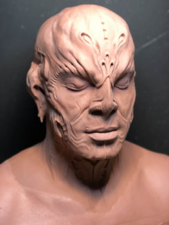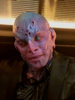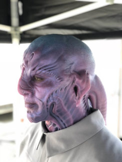 Fesoj from Star Trek: Picard. This was one of the many background aliens created for the show. Silicone prosthetic makeup consisting of 4 overlapping pieces as well as contact lenses.