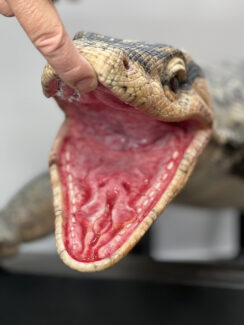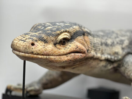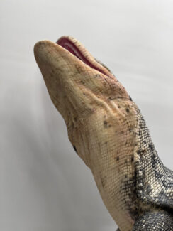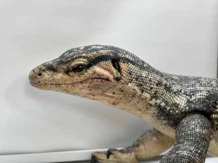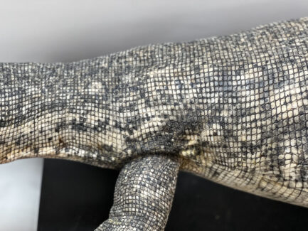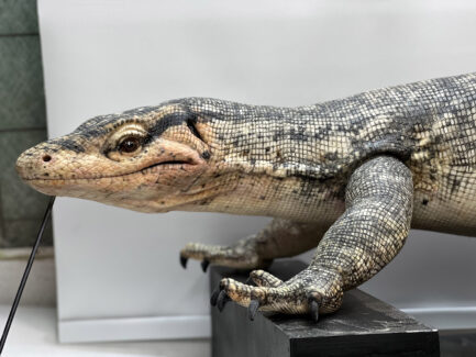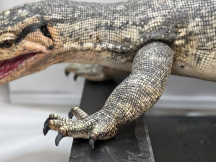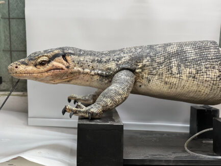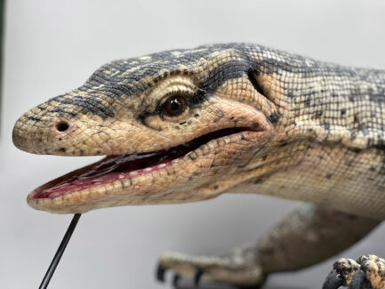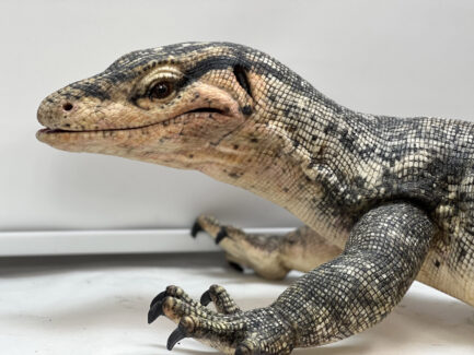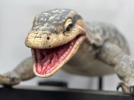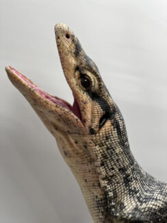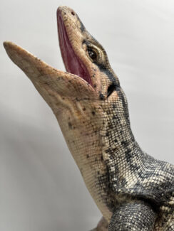 Silicone puppet duplicate of live monitor lizard. This piece was sculpted to match a real referenced lizard along with a paint match to its specifications. Rod puppeteered feet with a hand puppeteered mouth, head, and neck. Saliva tubes were run into the upper palate.