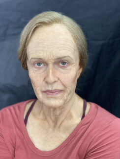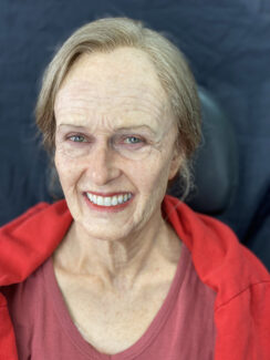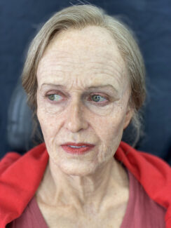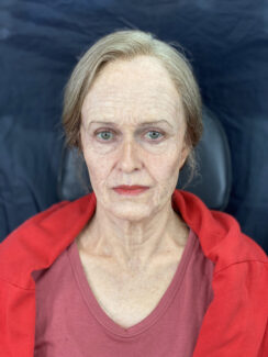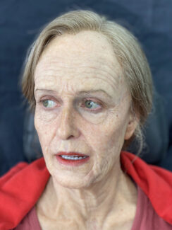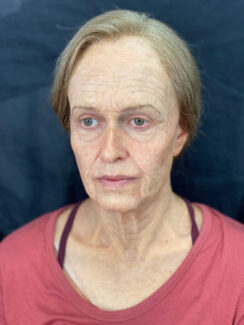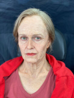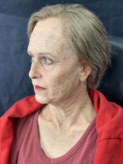 For Angelyne we needed to age Diana Gitelman into her 70’s. This makeup consisted of 10 overlapping silicone prosthetics, a lace wig, lace brows, and aged contact lenses.
