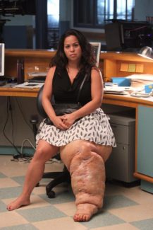 Scream Queens season 2, a silicone slip on leg with foam interior for an extreme case of lymphedema. Photos and on set work by Mike Mekash.